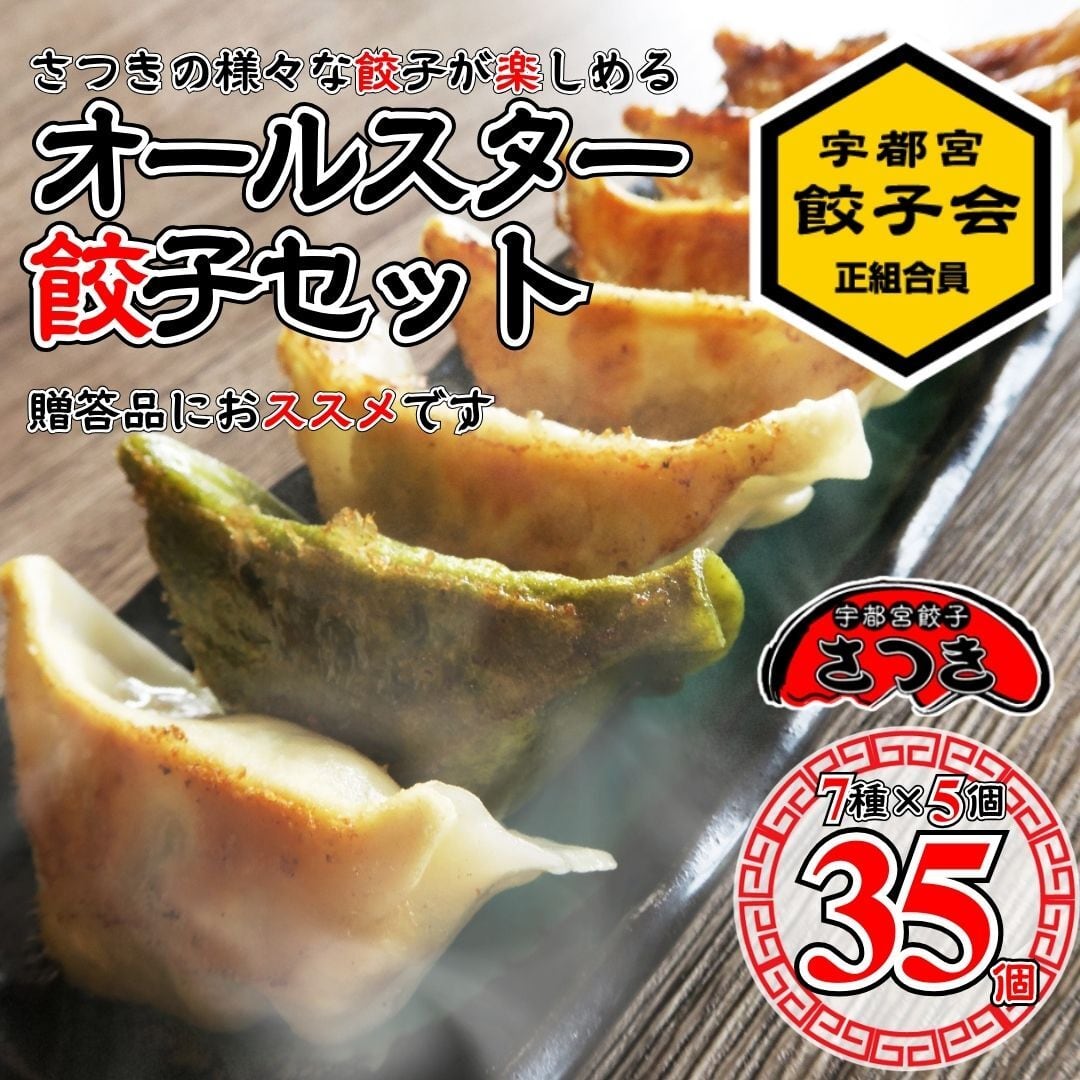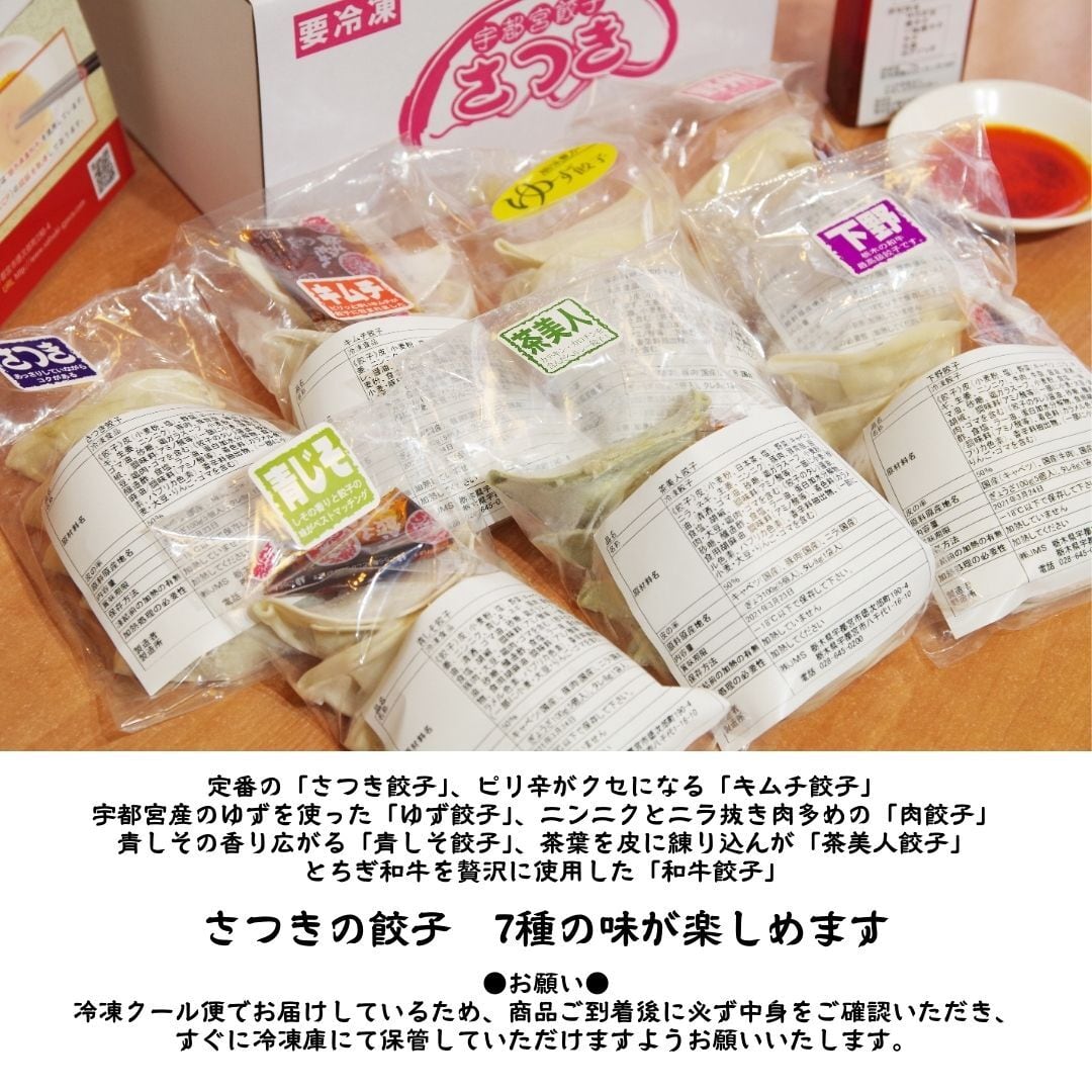 さつき餃子、キムチ餃子、ゆず餃子、肉餃子、青しそ餃子、茶美人餃子、和牛餃子の全7種類×5個